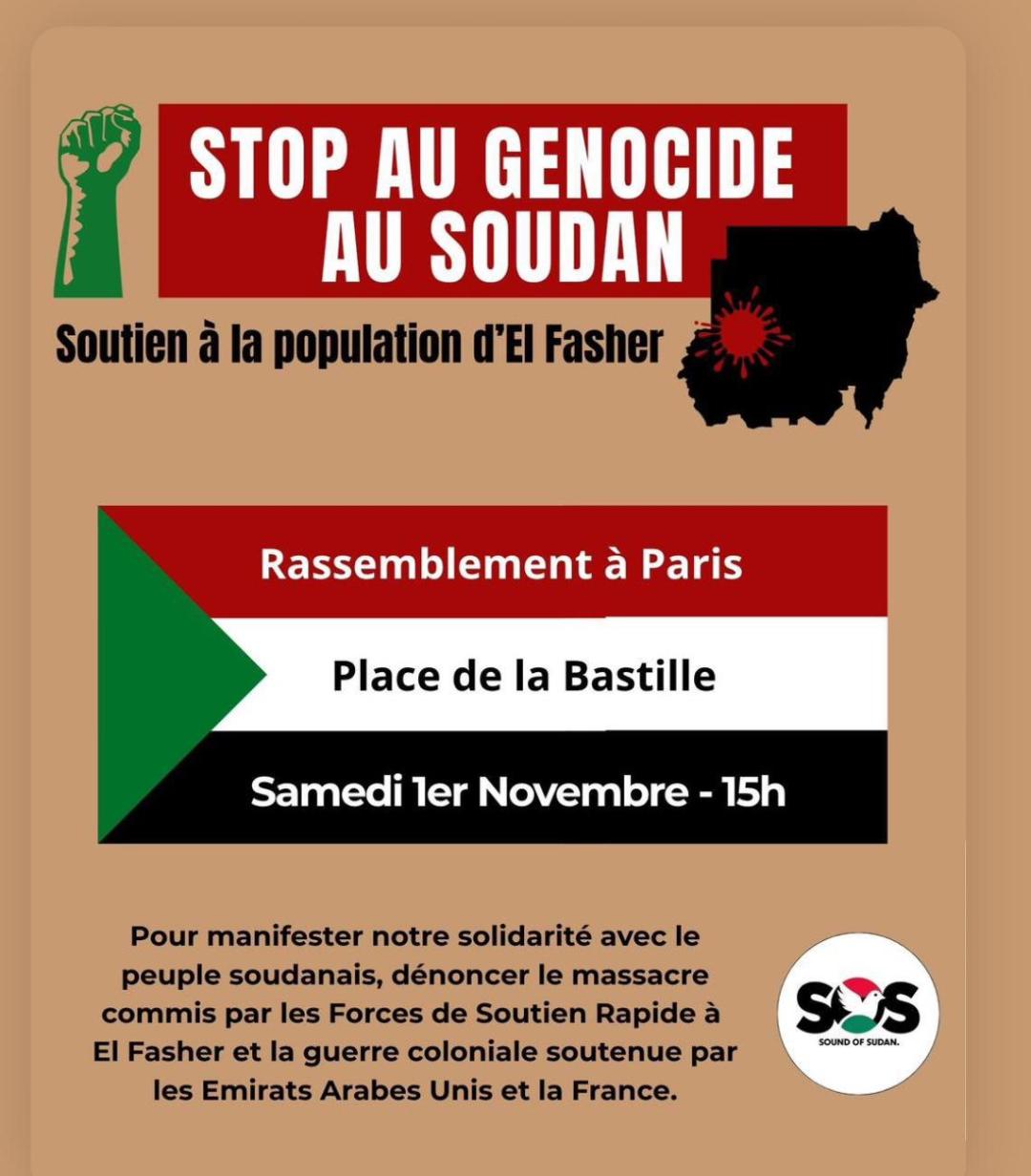 Rassemblons-nous samedi 1er novembre à 15h place de la Bastille, pour dénoncer le massacre commis par les Forces de Soutien Rapide à El-Fasher, et la guerre coloniale au Soudan soutenue par les Émirats Arabes Unis et la France. Depuis le 15 … Continuer la lecture