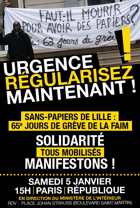 Lundi 7 janvier sera le 67ème jour de grève de la faim des sans-papiers de Lille. Les choses sont désormais dramatiquement simples : des vies sont en jeu.