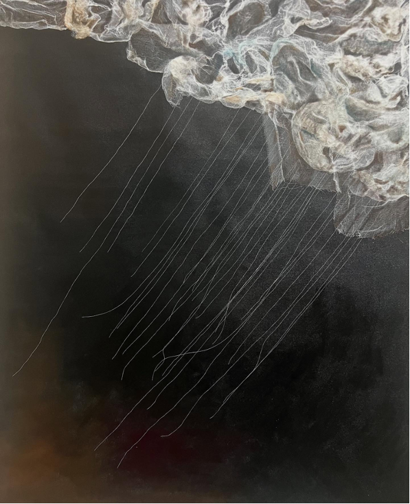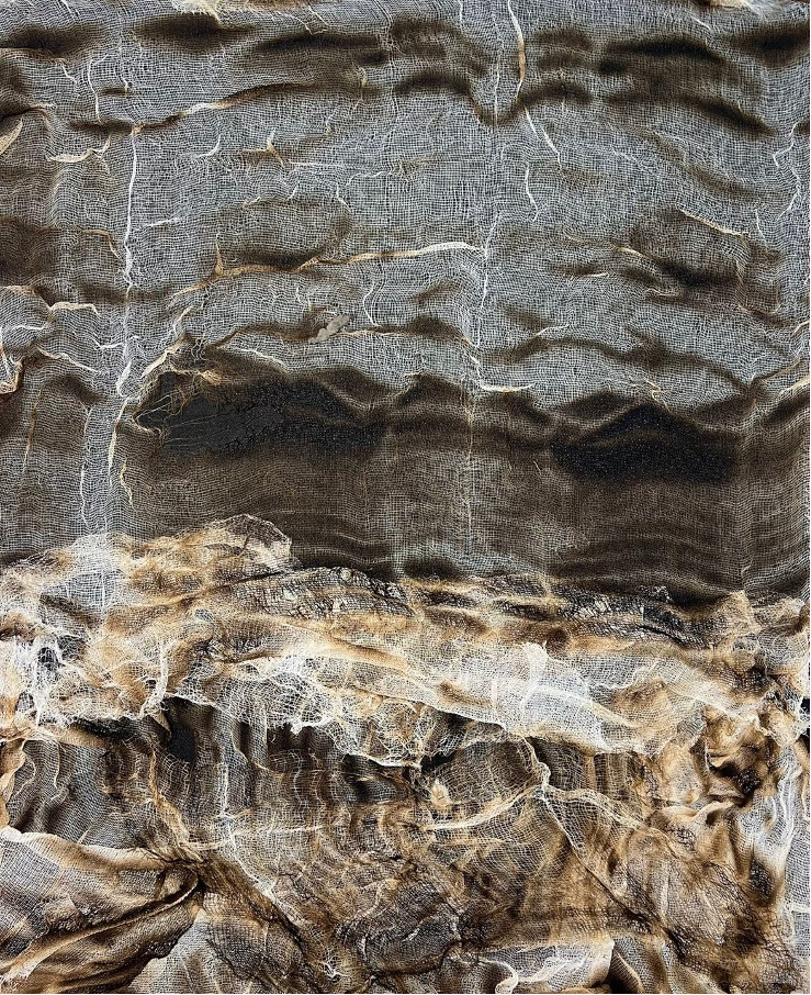 Al Aziz ‘Aatef décrit visuellement les horreurs du génocide comme une scène anormale. Des fils de bandage tissent ensemble une mer, uniquement pour en souligner les innombrables blessures. Une terre entière enveloppée de bandages finement cousus. Les « lignes coloniales » entre la Palestine historique et la géographie de la bande de Gaza sont délimitées par des intensités différenciées de bandages, de blessures. Ce ne fut jamais une « invasion », mais une évasion de prison, un retour. C’est une scène anormale mais profondément historique, couches sur couches de dépossession. L’objectif du génocide est de déposséder, de transférer et de discipliner. Face à la résistance et à la persévérance des Palestiniens à Gaza et au resserrement du blocus sous génocide avec la complicité des régimes arabes voisins tels que l’Égypte, ce projet de dépossession totale a échoué. En dépit de l’insistance génocidaire implacable du sionisme, l’alternative désormais envisagée, d’une proposition de cessez-le-feu à l’autre, est de discipliner Gaza en un territoire soumis à une version remaniée de la paix néolibérale, qui laisse intacte la question coloniale et reproduit organiquement sa ségrégation géographique d’avec la Cisjordanie.
