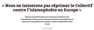 Plusieurs organisations dénoncent dans cette tribune publiée dans Politis la répression du Collectif contre l’islamophobie en Europe, après le placement en garde à vue de plusieurs de ses salarié·es et la perquisition de leur domicile, comme le révélait Politis, mardi 13 mai.