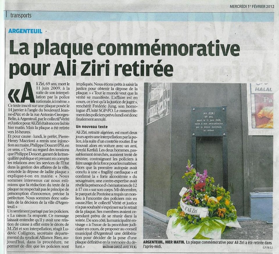 Le collectif « Justice et Vérité pour Ali ZIRI », composé d’une trentaine d’associations, d’organisations politiques, syndicales et de citoyens, avec le soutien de personnalités diverses dont celles de M. Jacques Gaillot et M. Stéphane Hessel, a posé une plaque en hommage à M. Ali ZIRI, à Argenteuil le 14 janvier 2012.