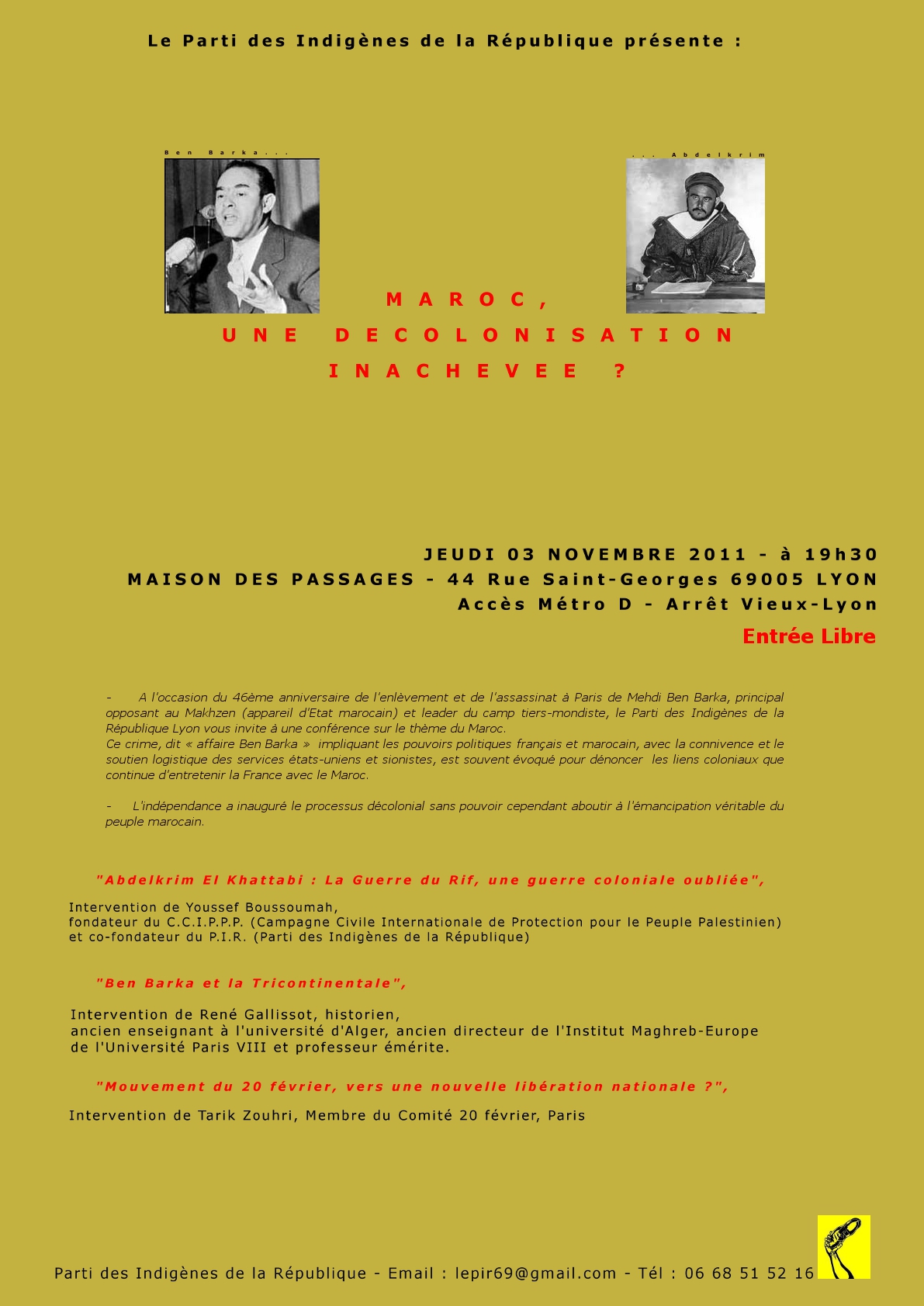 A l’occasion du 46ème anniversaire de l’enlèvement et de l’assassinat à Paris de Mehdi Ben Barka, principal opposant au Makhzen (appareil d’Etat marocain) et leader du camp tiers-mondiste, le Parti des Indigènes de la République Lyon vous invite à une conférence sur le thème du Maroc.