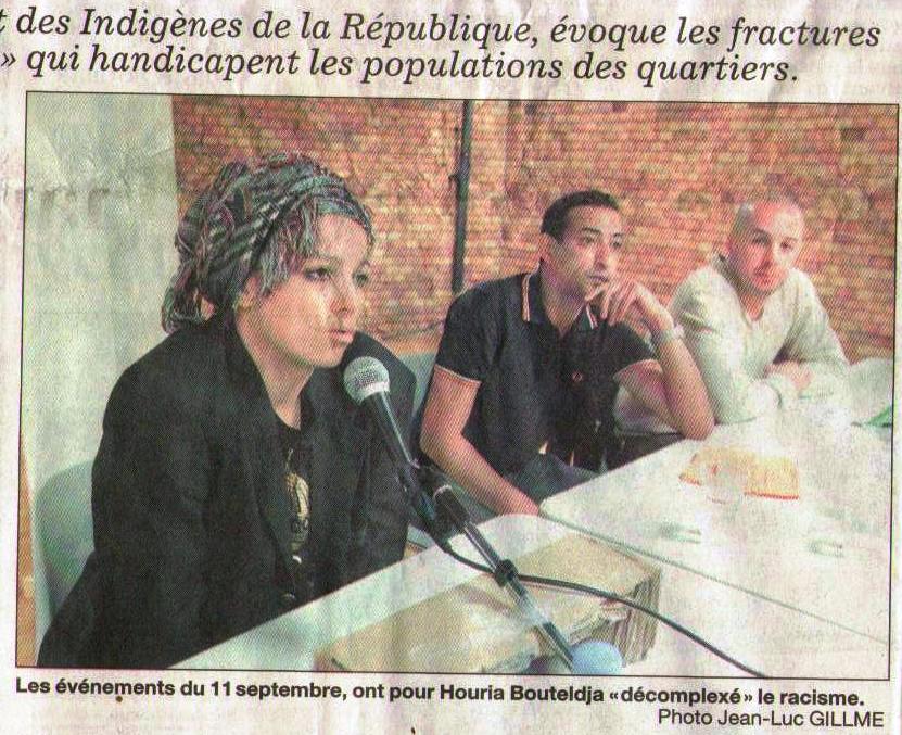 Ci-dessous, un article paru dans « L’Est républicain » sur la conférence donnée le 31 octobre 09, à Montbéliard, par Houria Bouteldja sur les luttes décoloniales. Cette conférence avait été co-organisée par Co-organisé par les Amis de l’Emancipation Sociale, les Amis du Monde diplomatique Nord Franche Comté, Le Comité Vérité et Justice, le Mouvement des Indigènes de la République, le Réseau Averroès.