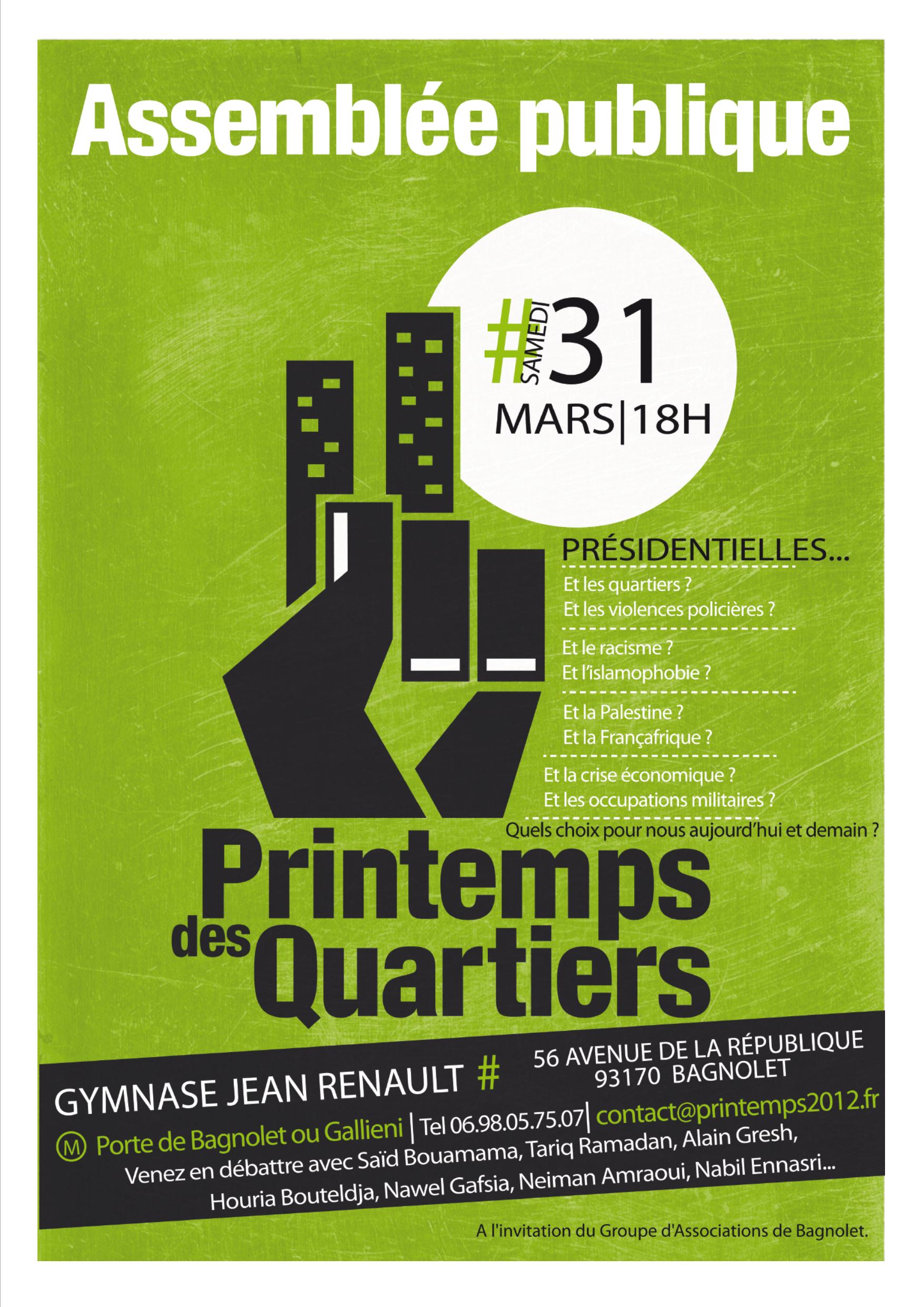 Nous ressentons également de la colère et de l’amertume contre l’acte de ce jeune homme qui prétendait agir pour les causes palestinienne et afghane. Par son acte il dénature la finalité de ces justes causes, en brouille le message et renforce le camp qu’il prétend combattre. À un mois de la présidentielle, sa folie meurtrière d’une part redynamise la campagne de Nicolas Sarkozy et celle de Marine Le Pen et dans le même mouvement fragilise les efforts du mouvement anti-raciste et anti-impérialiste dans sa lutte acharnée pour la justice et la liberté.